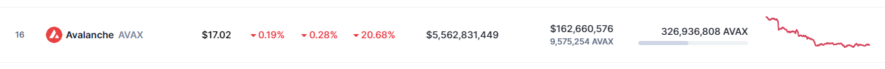 最近几天,AVAX 代币的表现有些乏善可陈。根据CoinMarketCap 的数据,过去一周,AVAX 的价格经历了 20.65% 的大幅下跌。